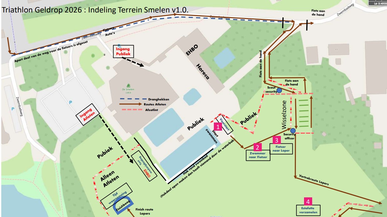 De loper staat klaar in het Zone-3. De fietser loopt naar Zone-3 (LINKS aanhouden in de wisselzone) en overhandigt het startnummer. De loper maakt startnummer vast op de borst. De loper verlaat Zone-3 en komt vanzelf op het loop parcours.